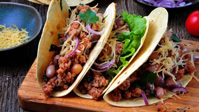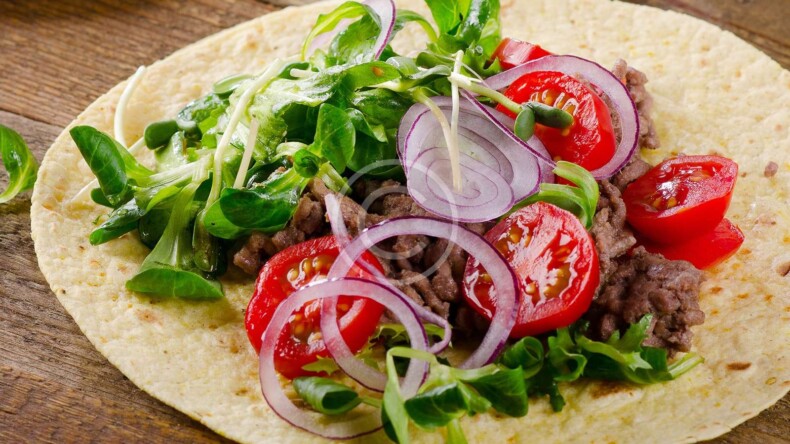 Ground beef, corn & wheat tortilla, cheese, vegetables and red sauce.